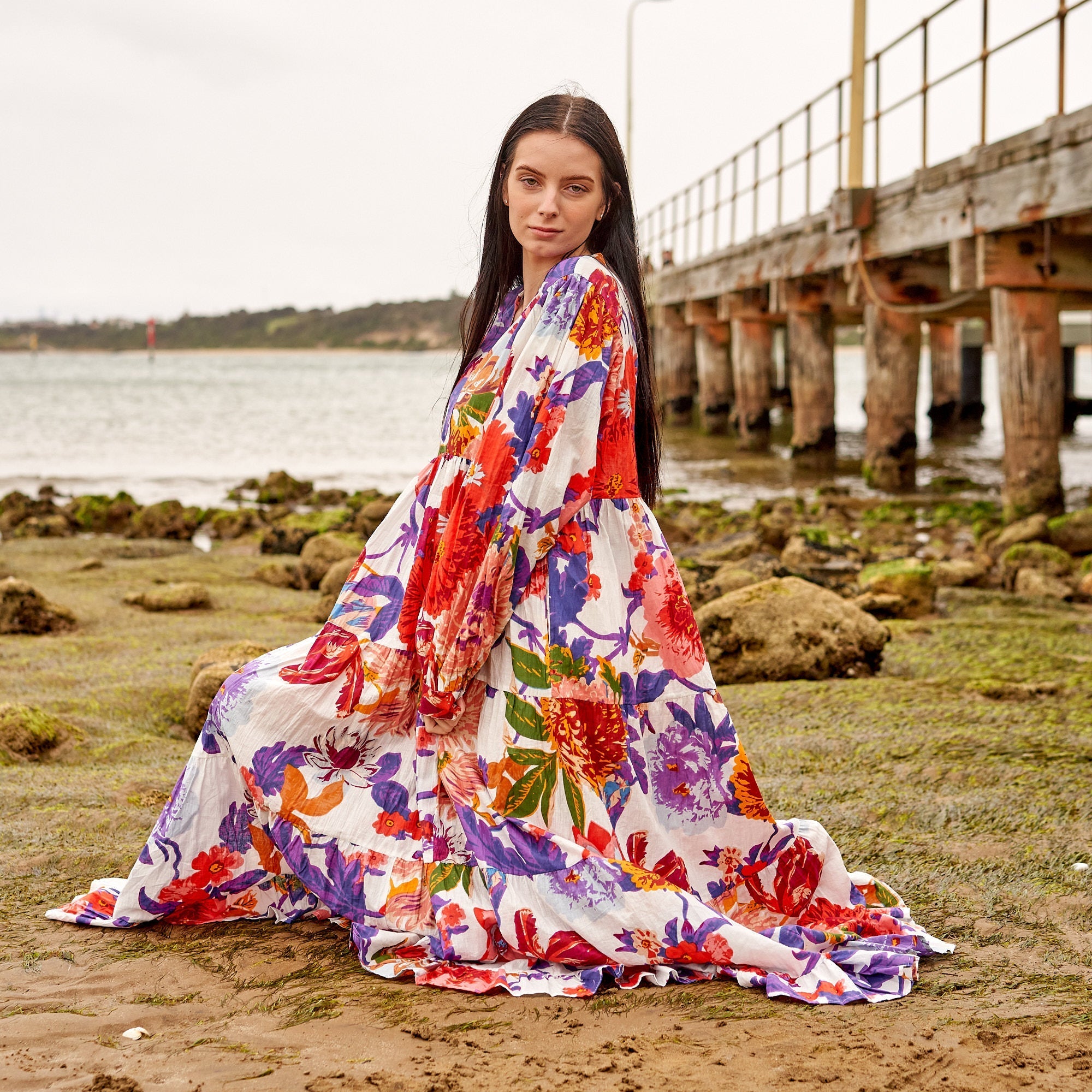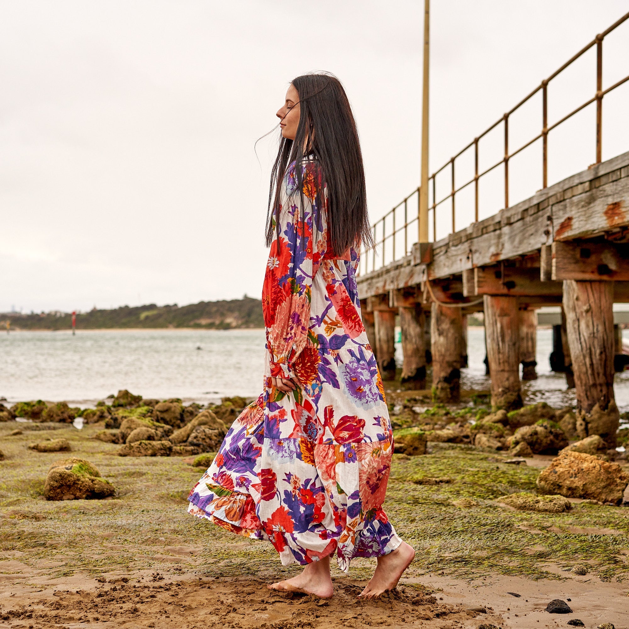 You will fall in love with this gorgeous piece; our boho maxi dress is bright, breezy and light. The elegant floral and framed design makes this dress timeless.