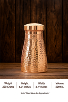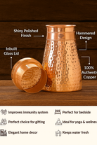 Elevate your nightstand with the Handcrafted Pure Copper Hammered Bedroom Bottle featuring a built-in copper glass and a premium shine finish. This 950ml handcrafted masterpiece is not just a hydration essential—it's a blend of wellness, elegance, and heritage.