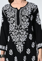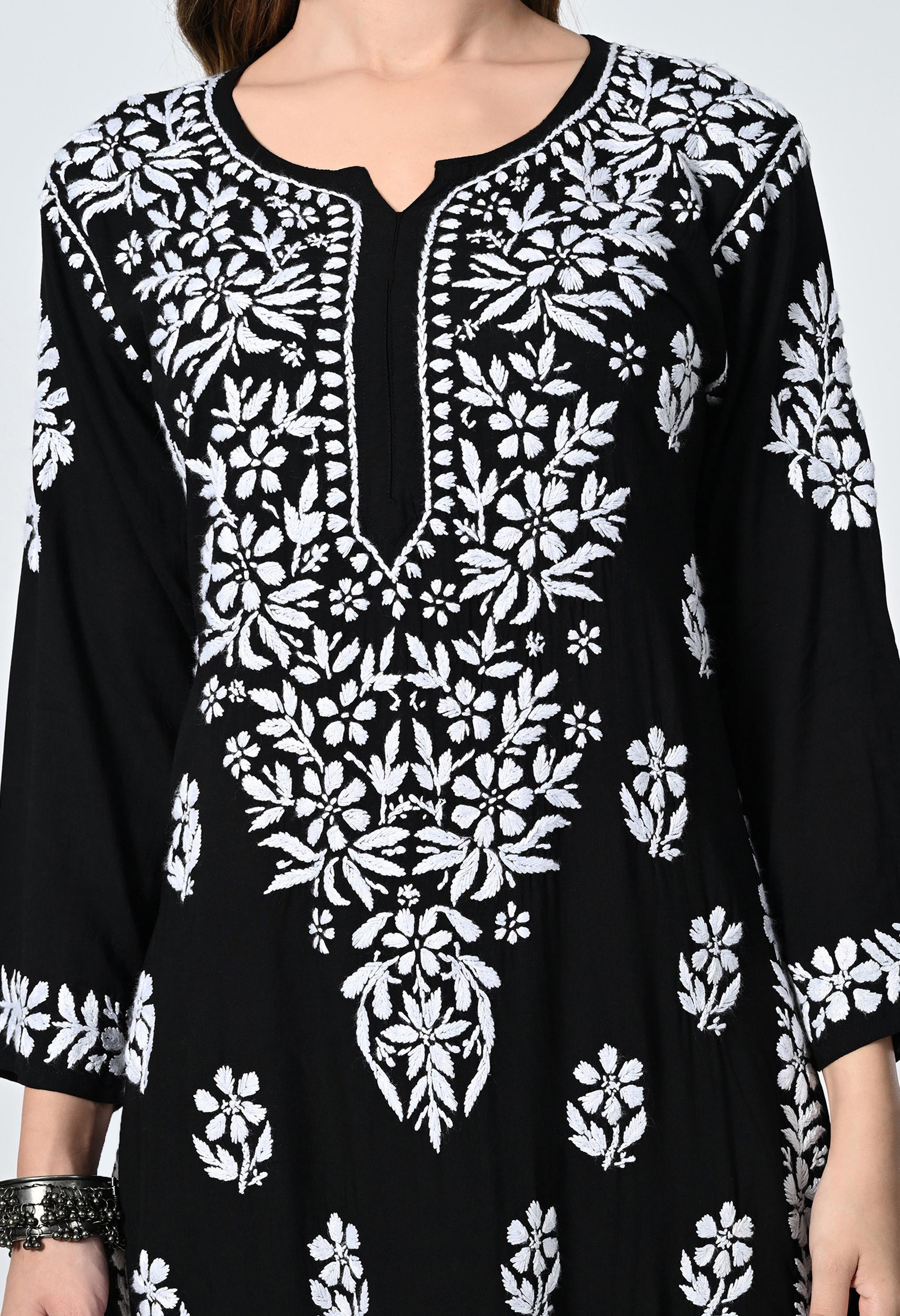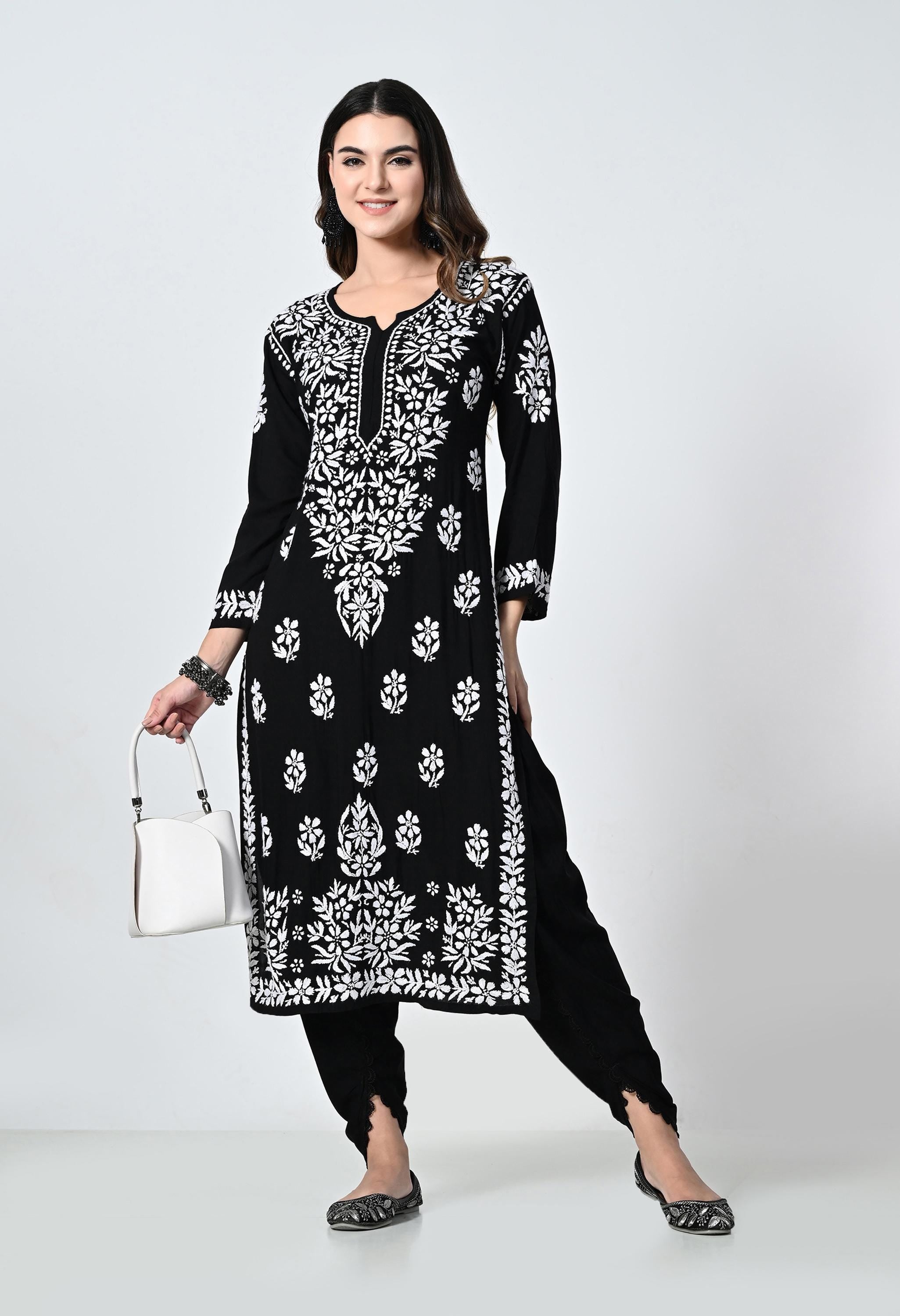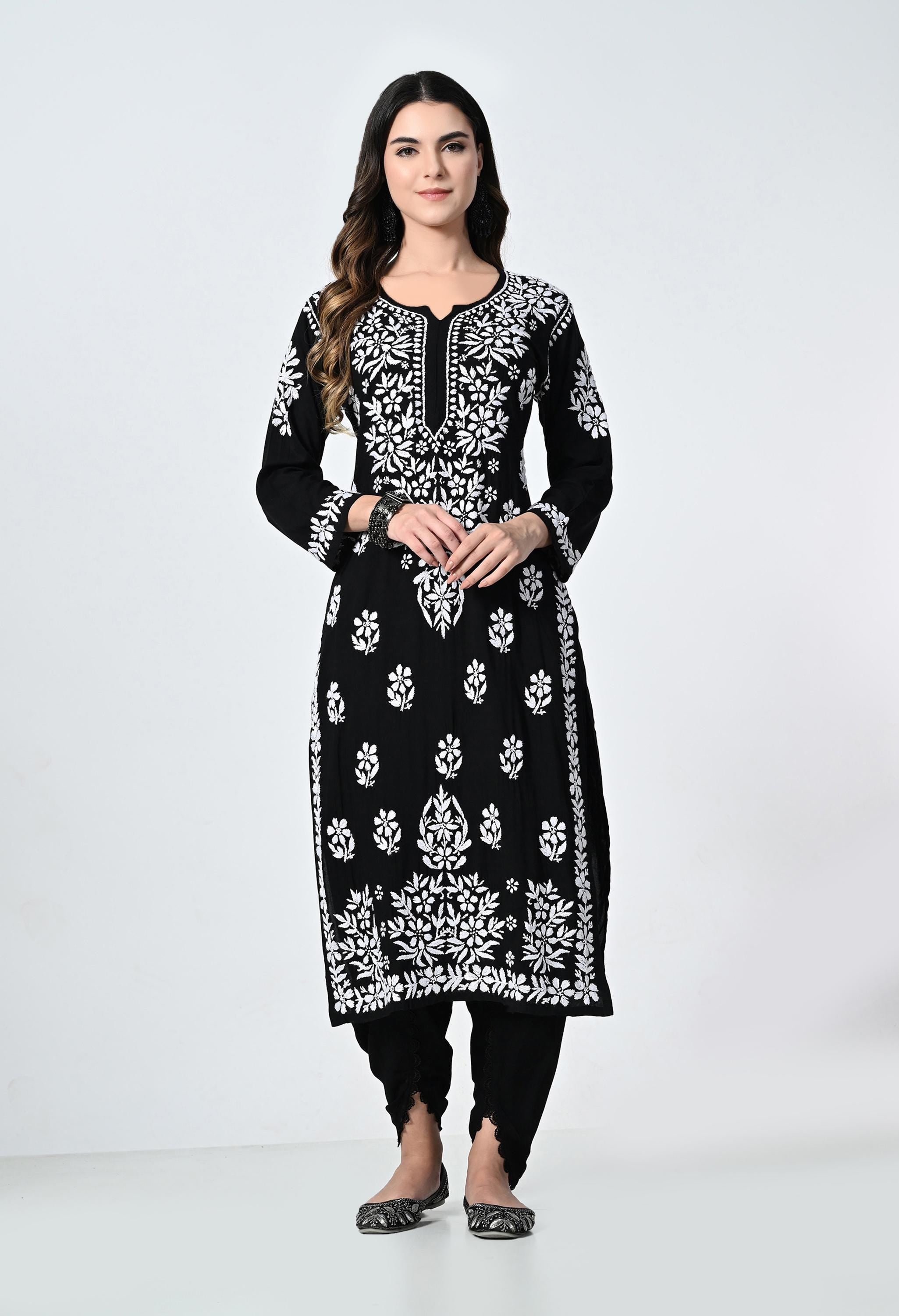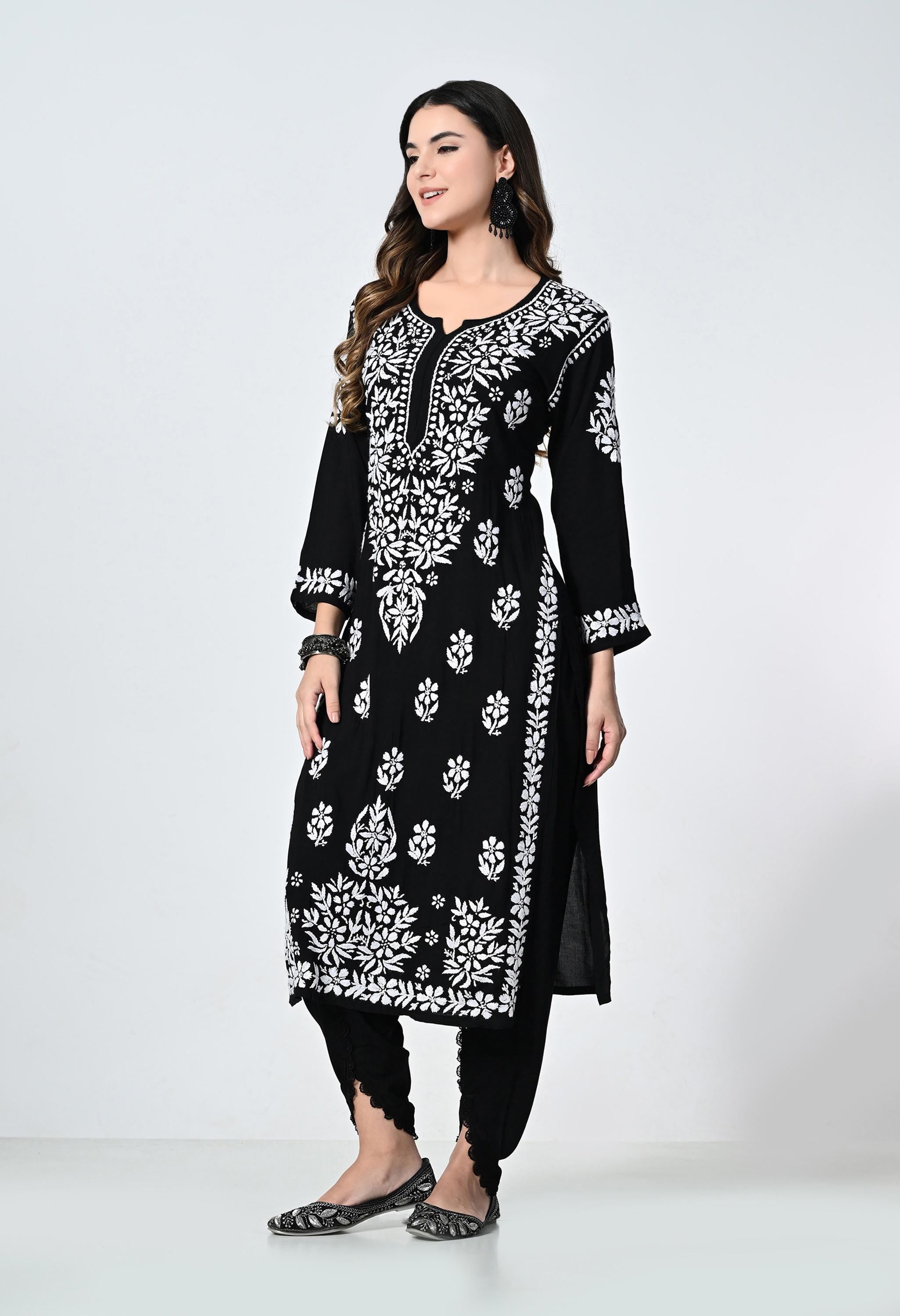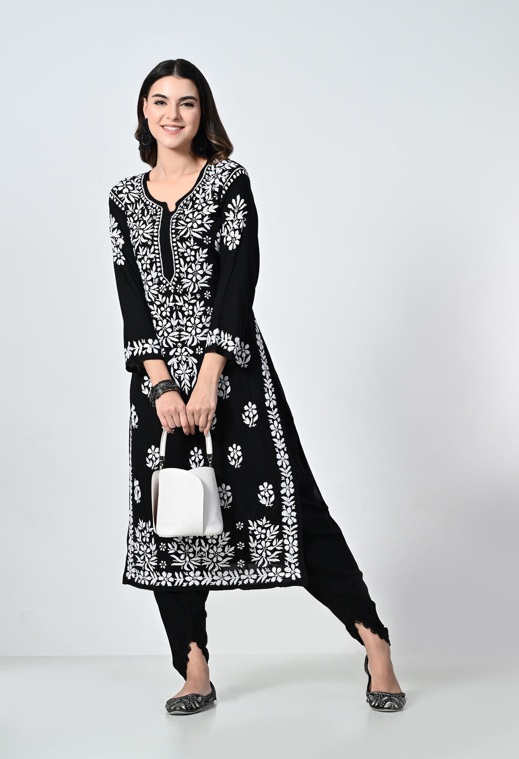Long Length Black Rayon Lucknowi Kurti With Tulip Pants