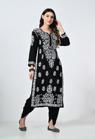 This elegant long-length Lucknowi Kurti features intricate white embroidery on a striking black base, showcasing timeless craftsmanship and ethnic charm. Designed for both traditional and contemporary looks, the kurti is paired with stylish black tulip pants to create a sophisticated and trendy ensemble.