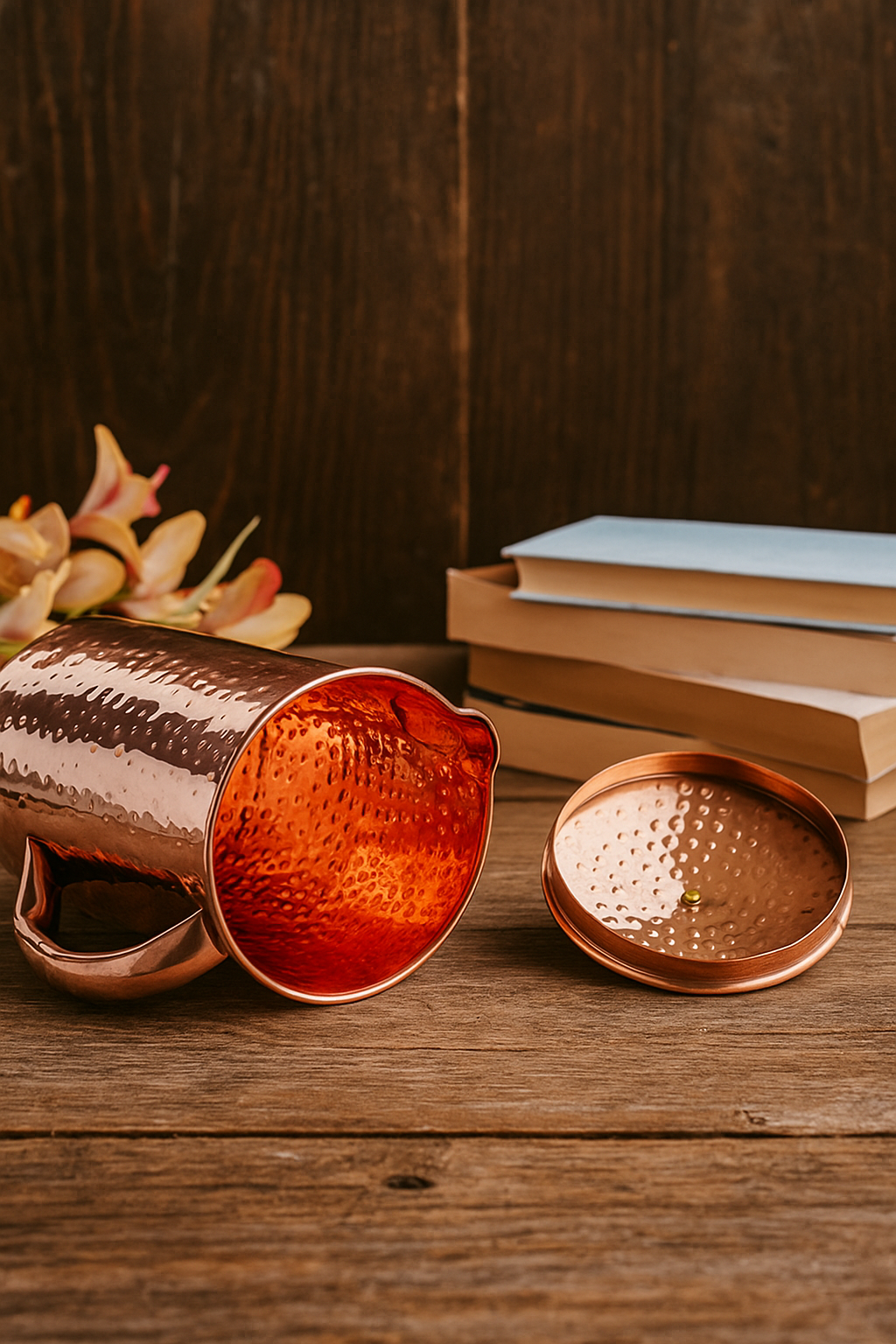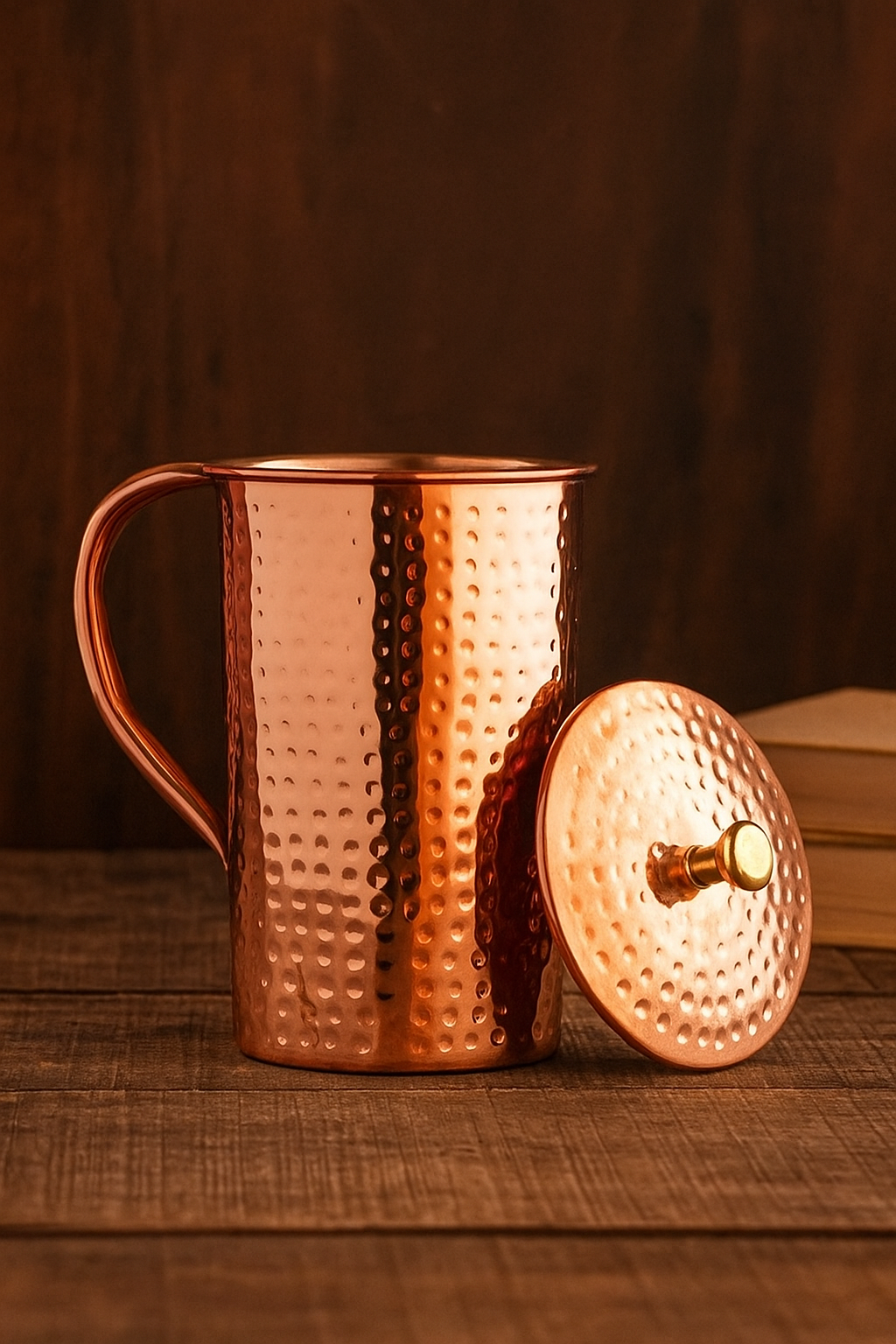 Add a touch of elegance and tradition to your table with the Pure Copper Hammered Design Jug with Lid – 1500 ML. Expertly crafted from pure copper, this jug features a stunning hammered design that blends timeless aesthetics with functional utility.