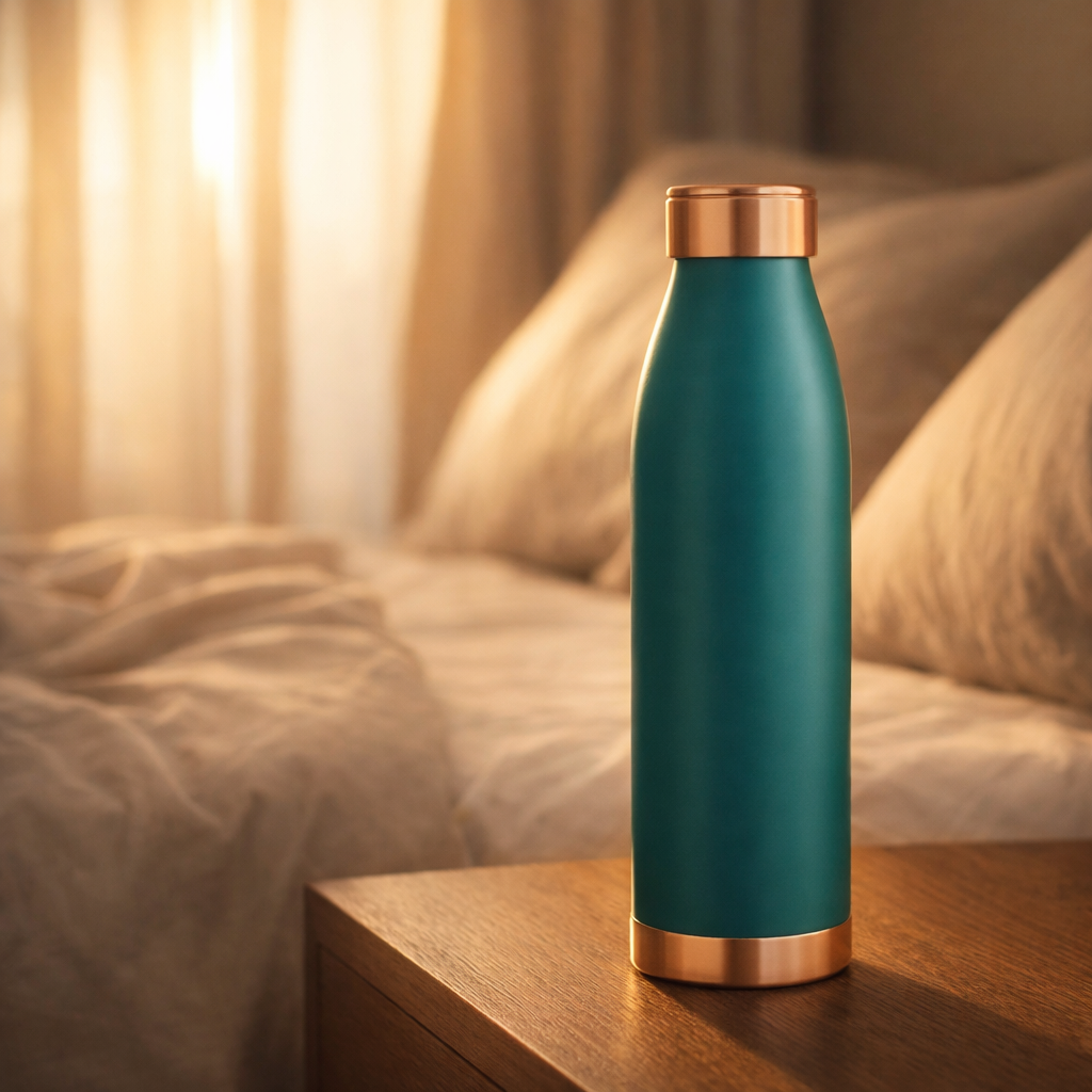 Pure Copper Hammered Silk Finish Bedroom Bottle with Inbuilt Glass - Gray 950ml