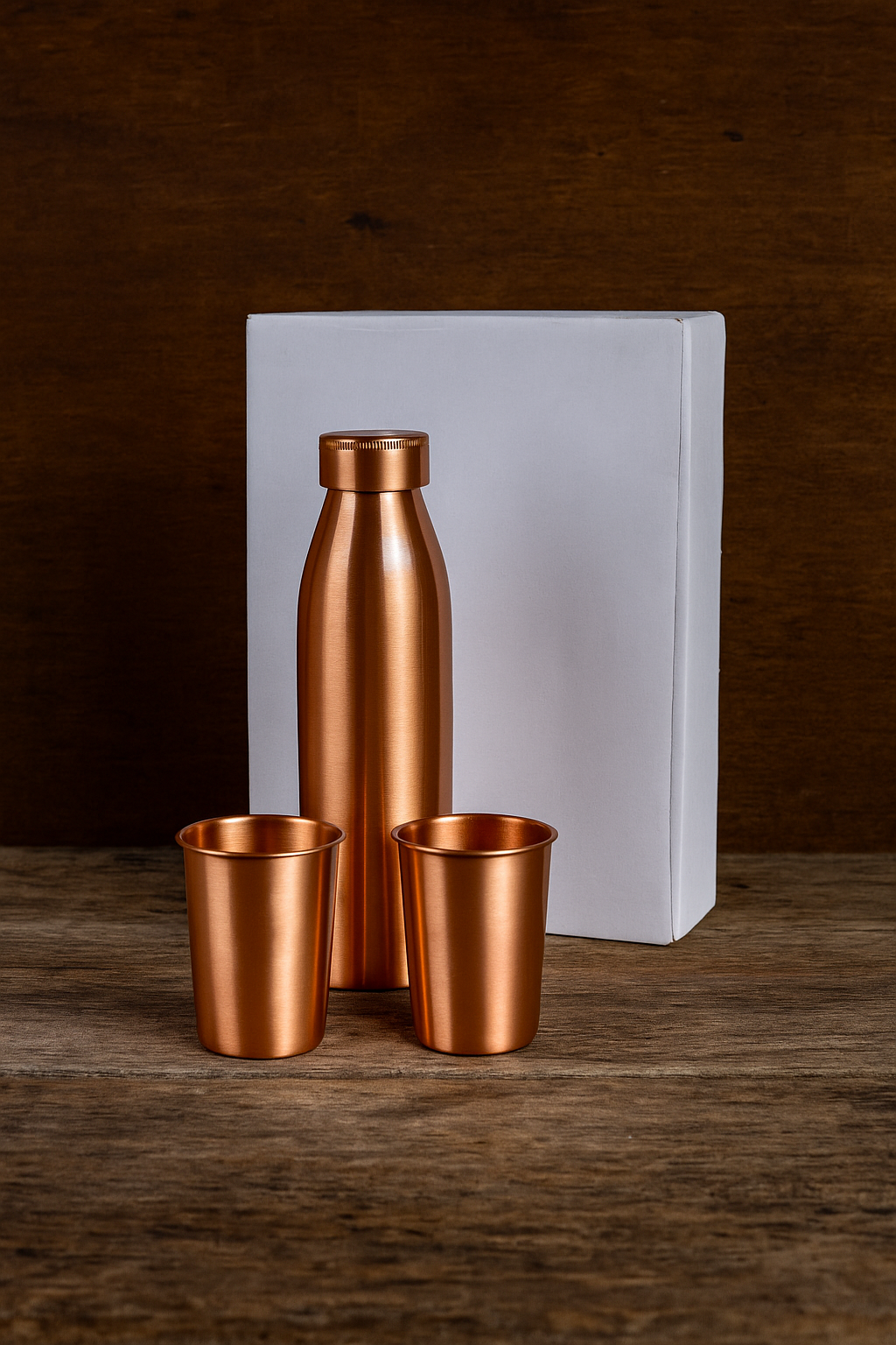 Celebrate wellness and elegance with the Pure Copper Drinkware Gift Set, featuring a 900ml seamless copper bottle and two 275ml copper glasses—beautifully packaged in a premium gift box. Perfectly blending traditional Ayurvedic health practices with modern design, this handcrafted set is ideal for gifting or daily use.
