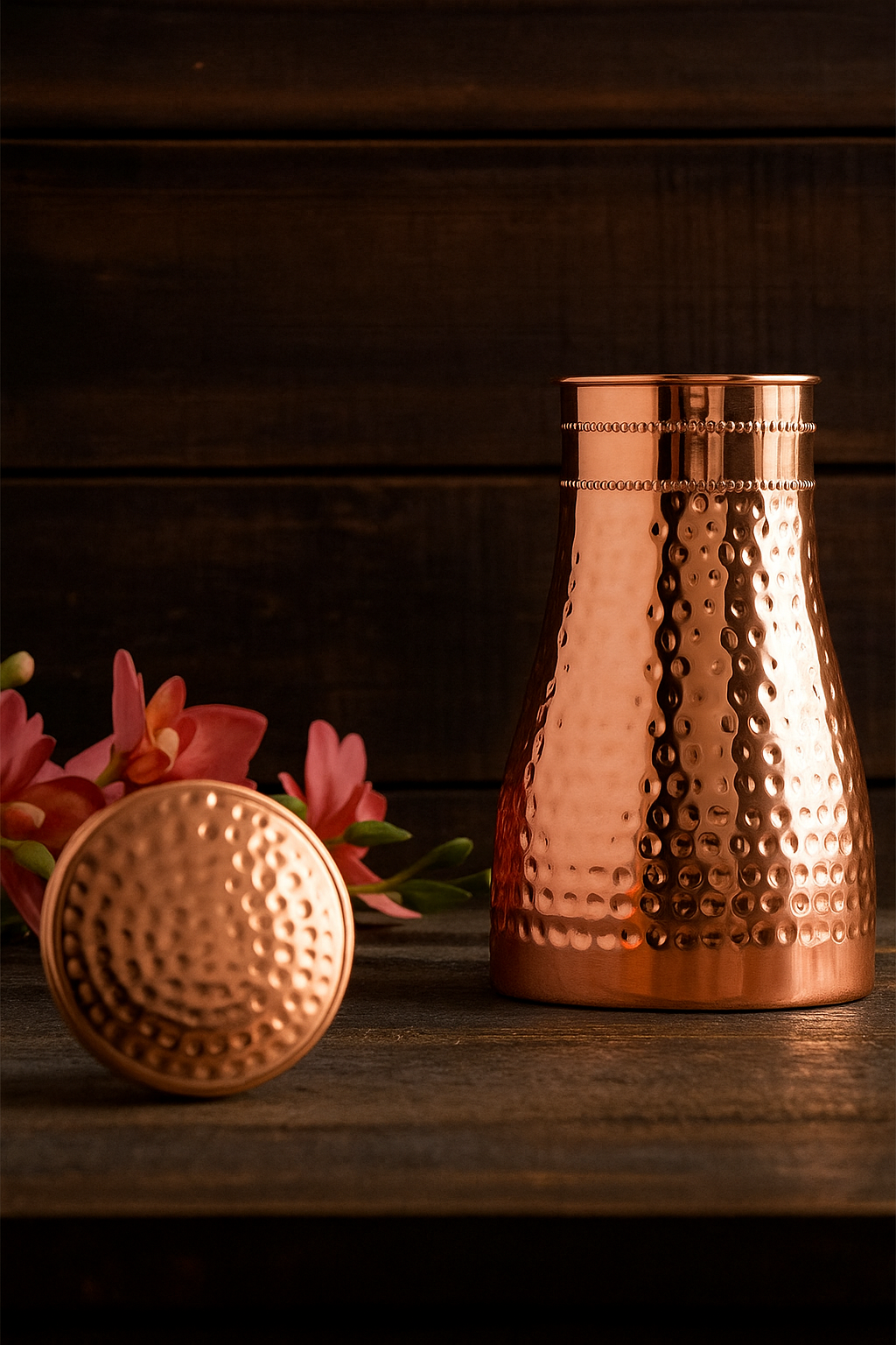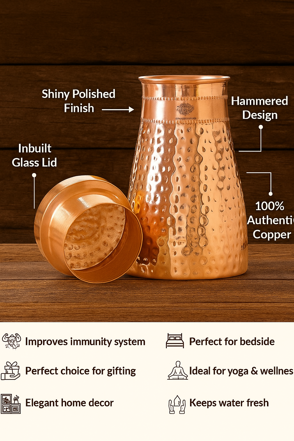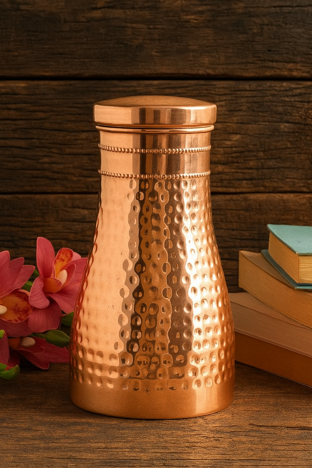 Elevate your nightstand with the Handcrafted Pure Copper Hammered Bedroom Bottle featuring a built-in copper glass and a premium shine finish. This 950ml handcrafted masterpiece is not just a hydration essential—it's a blend of wellness, elegance, and heritage.
