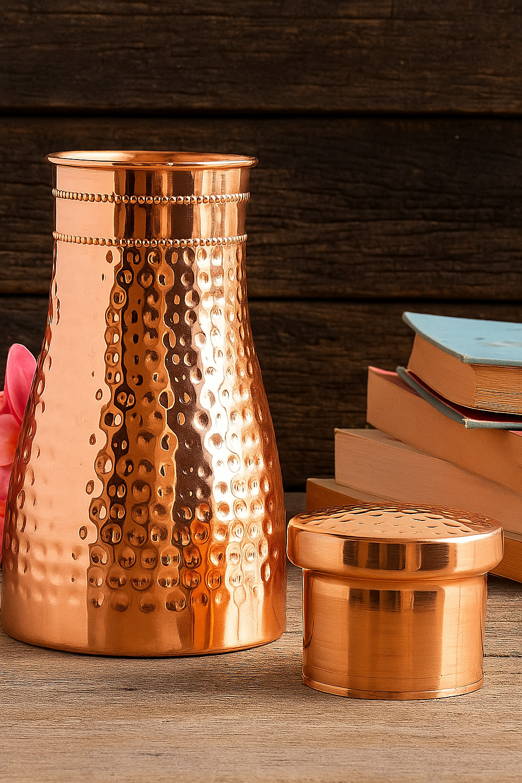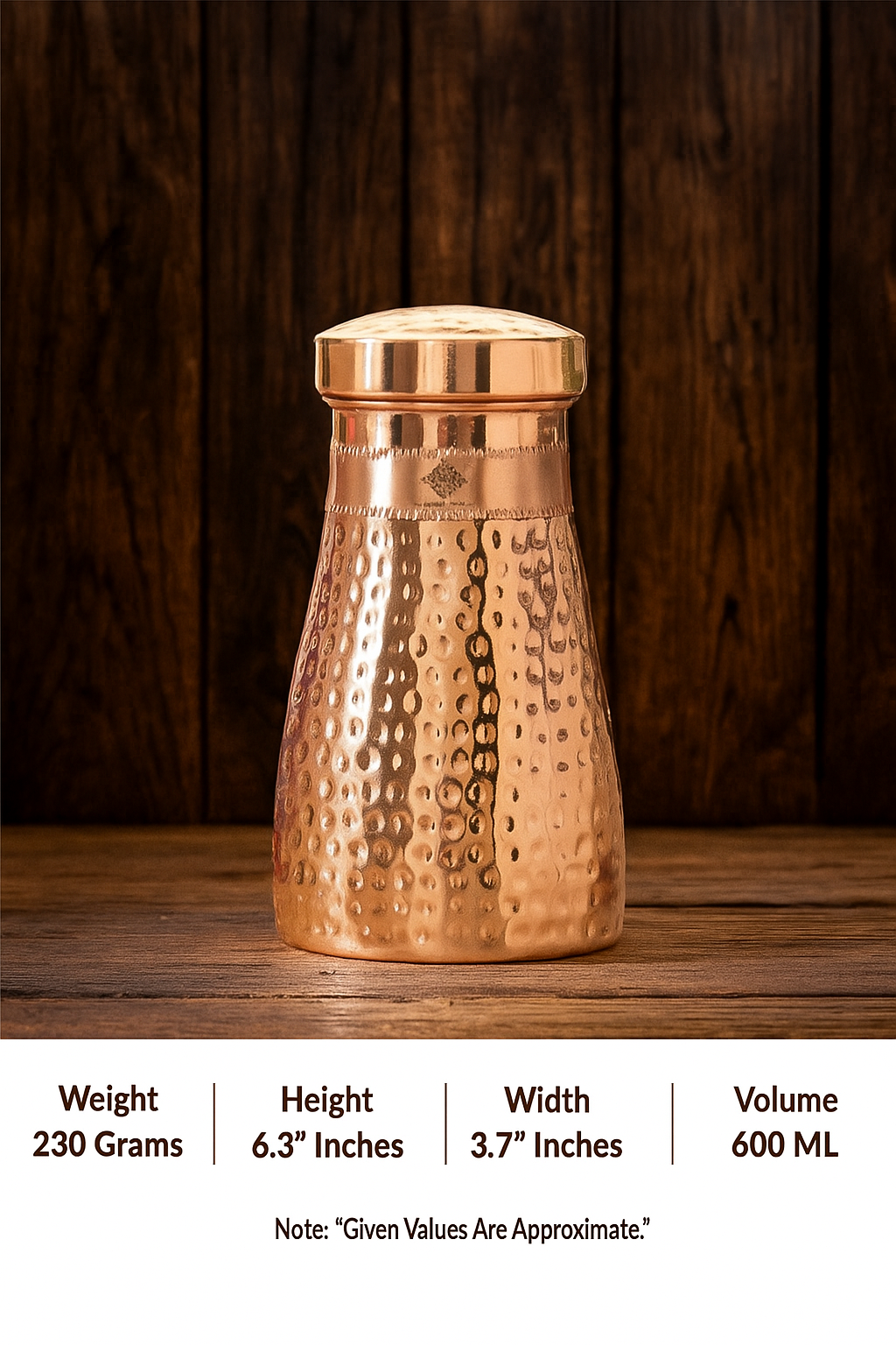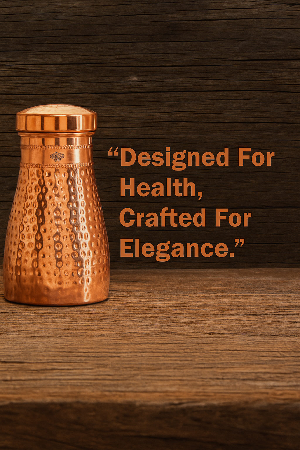 Elevate your nightstand with the Handcrafted Pure Copper Hammered Bedroom Bottle featuring a built-in copper glass and a premium shine finish. This 950ml handcrafted masterpiece is not just a hydration essential—it's a blend of wellness, elegance, and heritage.