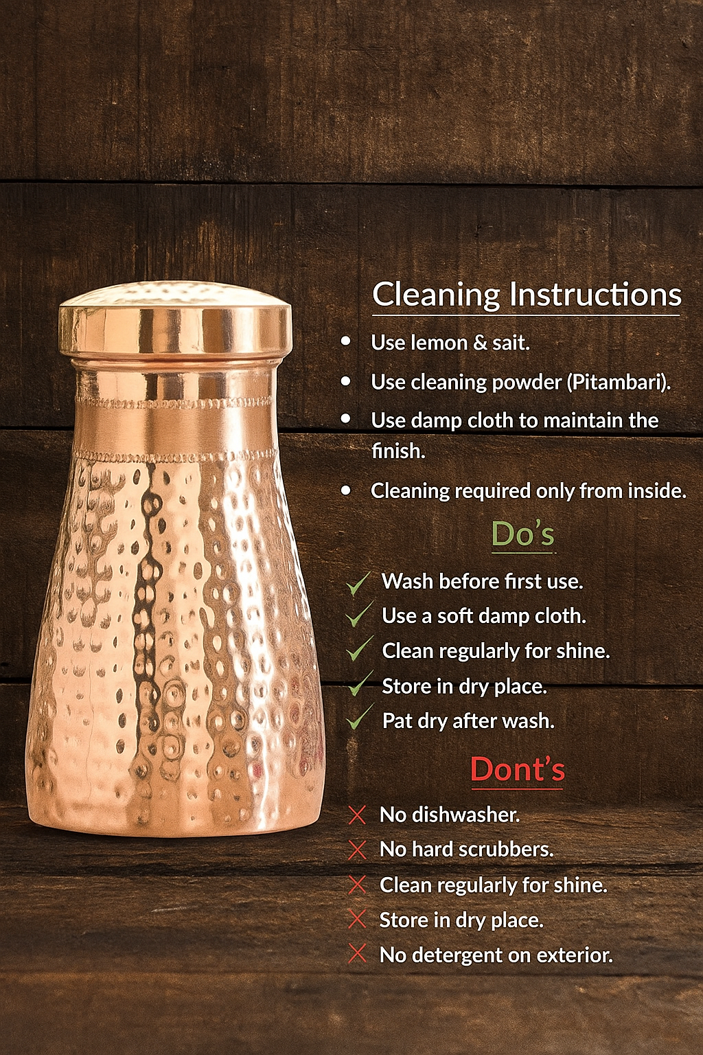 - Use a natural copper cleaning powder for deeper cleansing if needed.