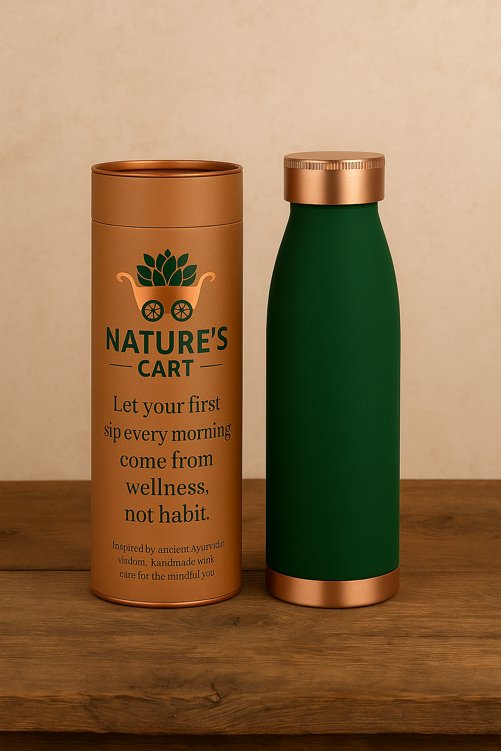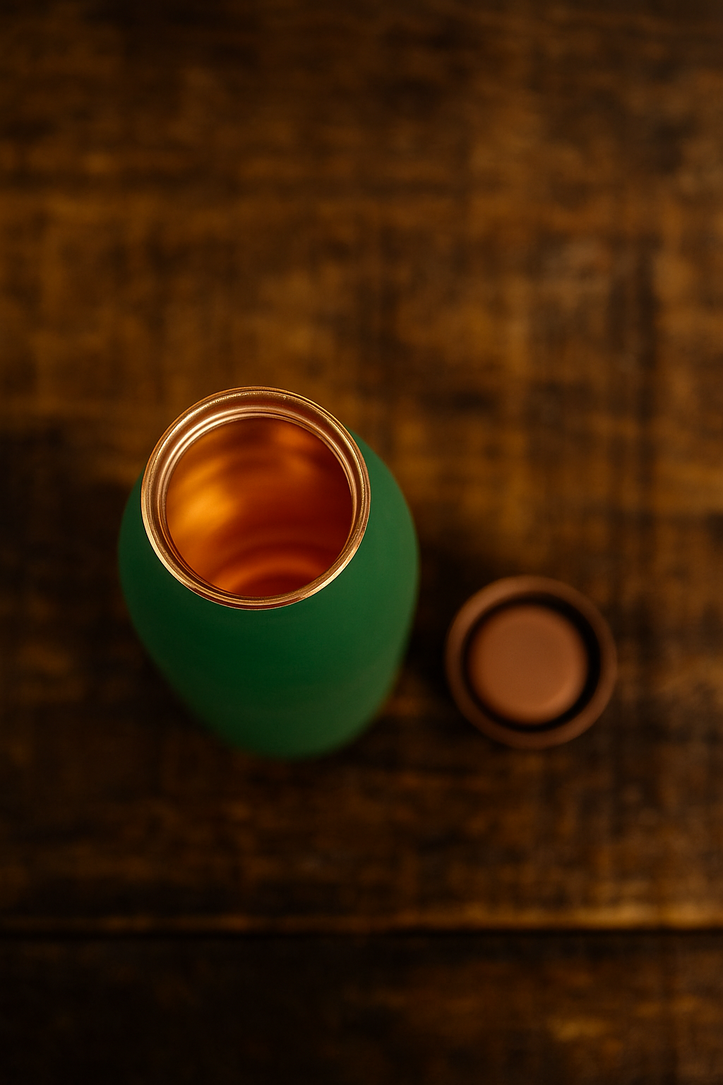 Green Silk Finish, 900ml. This handcrafted Pure Copper bottle blends Ayurvedic wellness benefits with a vibrant, modern look—perfect for daily use or stylish gifting.
