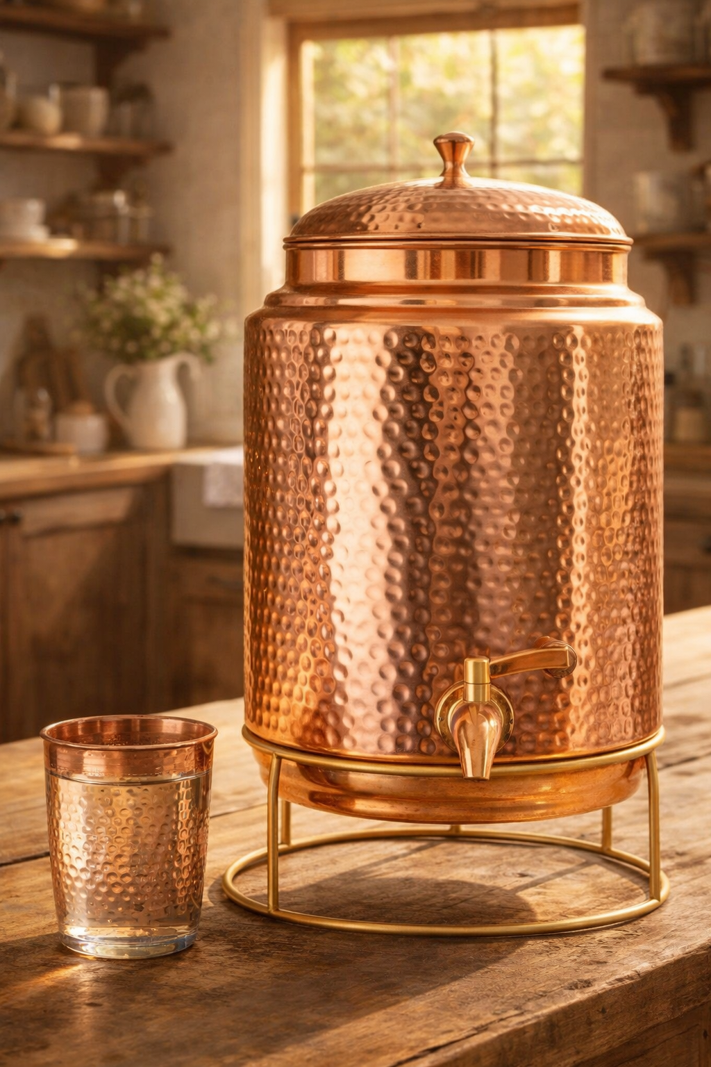 Premium 11L Pure Copper Water Dispenser with Brass Stand & Hammered Glass | Ayurvedic Storage Pot