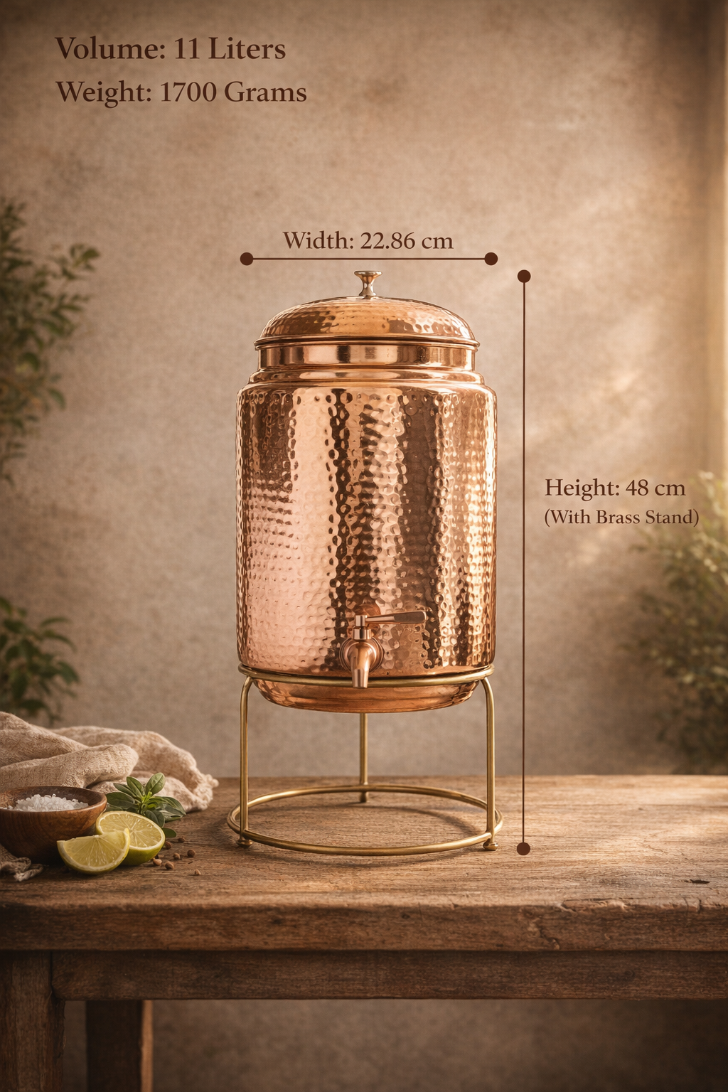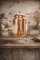 Elevate your hydration ritual with our 11 Liter Pure Copper Water Pot, handcrafted in a traditional hammered finish and paired with a sturdy brass stand.