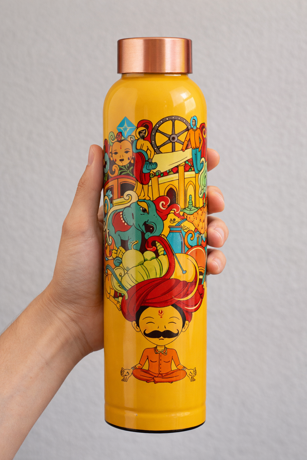 - Design: The bottle features a distinctive Rajasthani Meena ""Padharo Mhare Desh"" printed theme, showcasing vibrant colors and intricate patterns inspired by the cultural heritage of Rajasthan, India. This design adds a touch of elegance and ethnicity to the bottle.