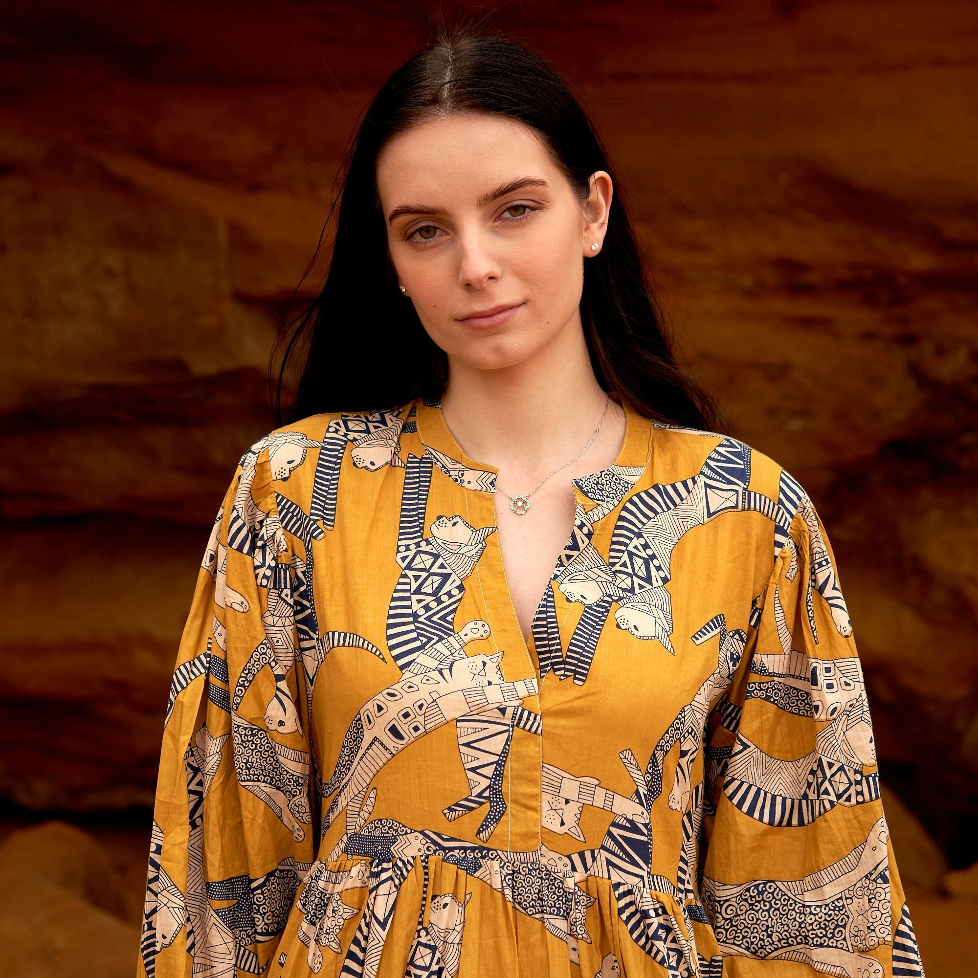 This dress is made 100% cotton. The fabric is screen printed by hand.