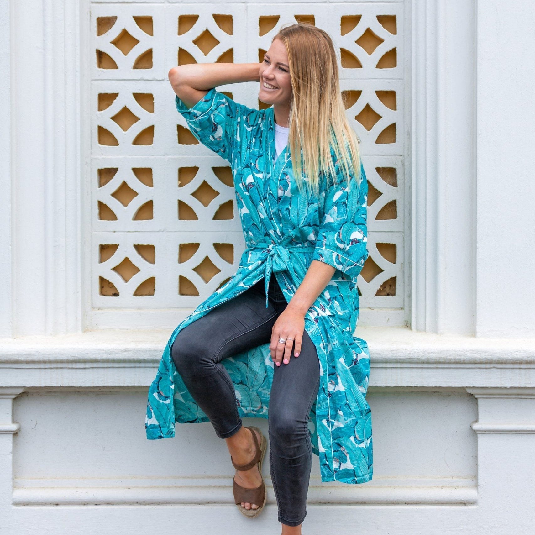 A beautiful Frida Kahlo inspired kimono robe for a super price. Perfect as a kimono, robe or a kaftan. Made from super comfy light weight cotton cambric so treat yourself to ultimate comfort whether you are simply winding up at night, getting ready for the morning or just cozying up in your lounge to binge watch a move on Netflix.