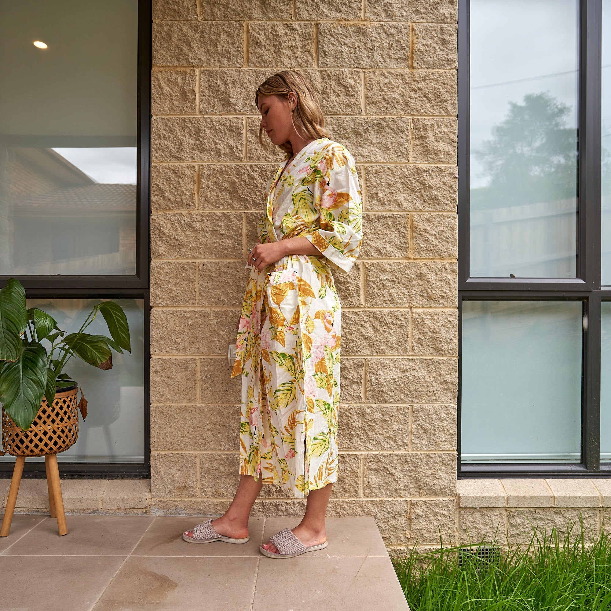 A beautiful Frida Kahlo inspired kimono robe for a super price. Perfect as a kimono, robe or a kaftan. Made from super comfy light weight cotton cambric so treat yourself to ultimate comfort whether you are simply winding up at night, getting ready for the morning or just cozying up in your lounge to binge watch a move on Netflix.