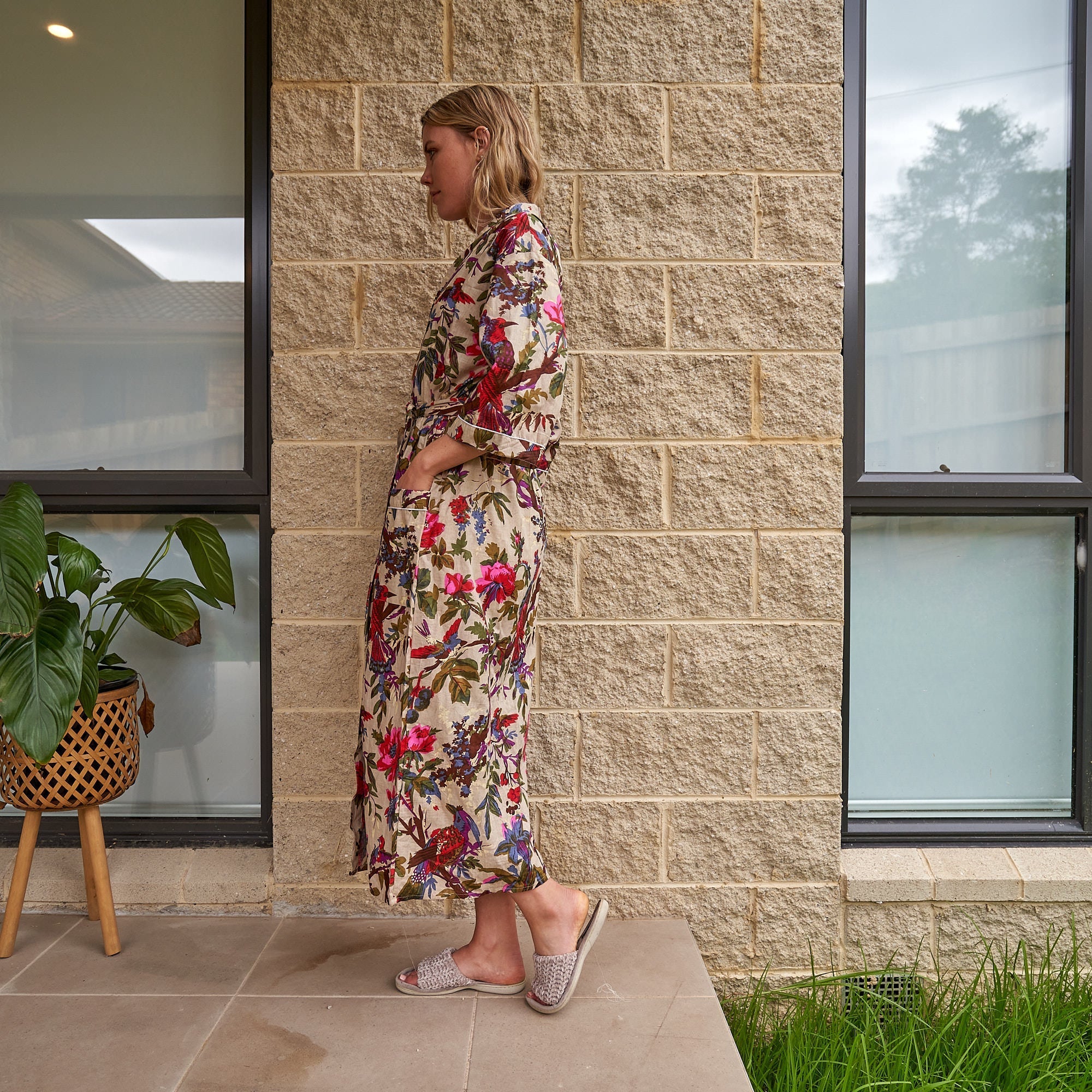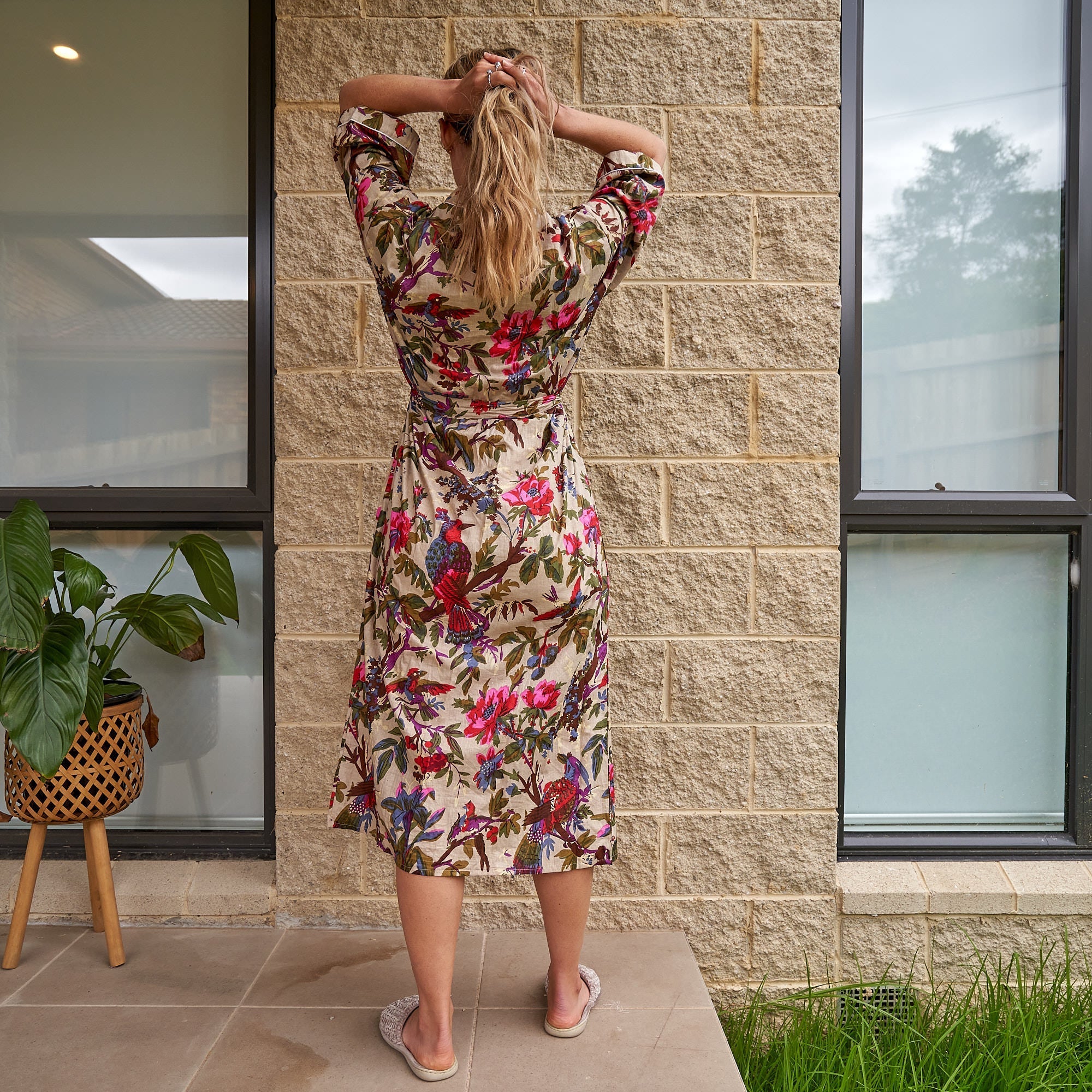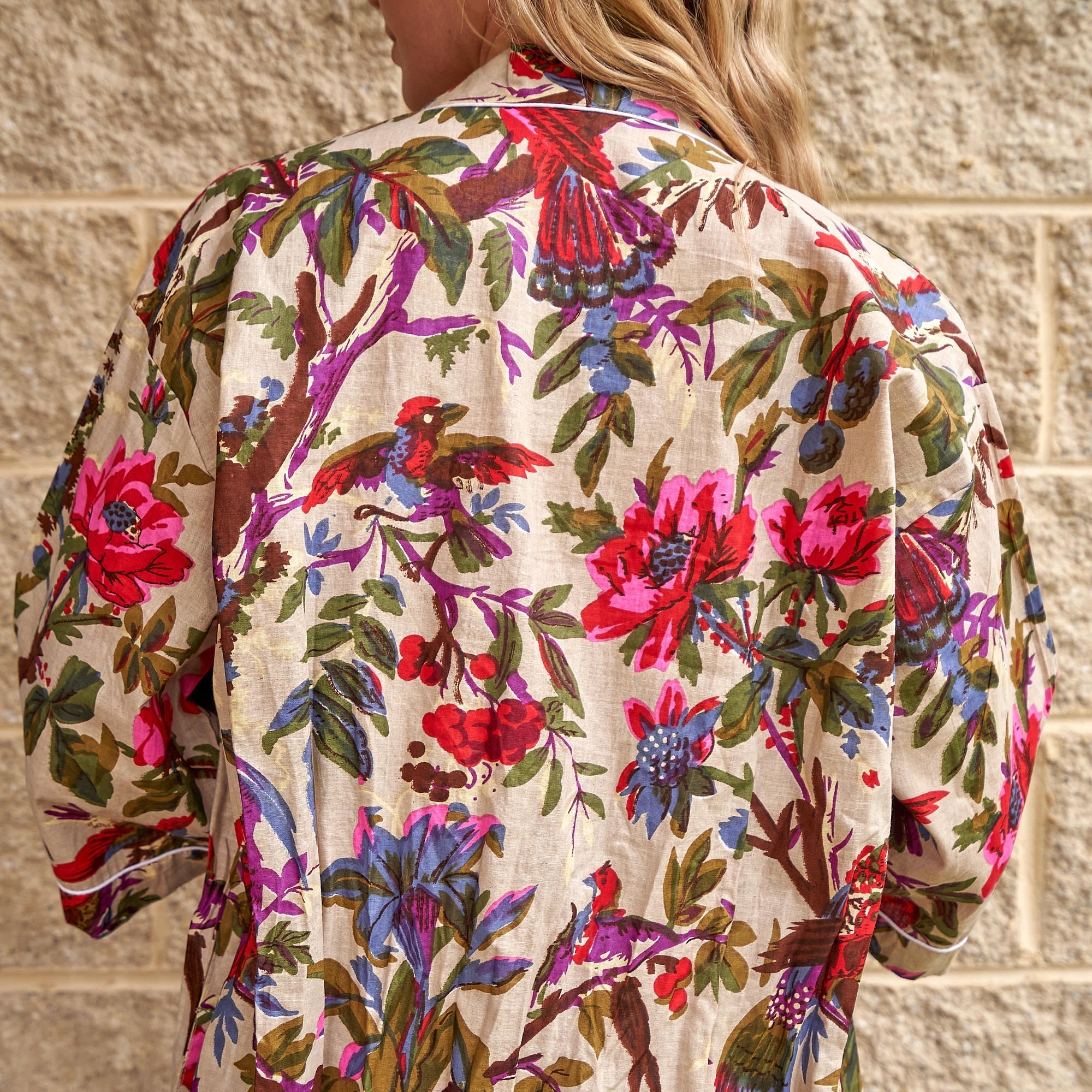 A beautiful Frida Kahlo inspired kimono robe for a super price. Perfect as a kimono, robe or a kaftan. Made from super comfy light weight cotton cambric so treat yourself to ultimate comfort whether you are simply winding up at night, getting ready for the morning or just cozying up in your lounge to binge watch a move on Netflix.
