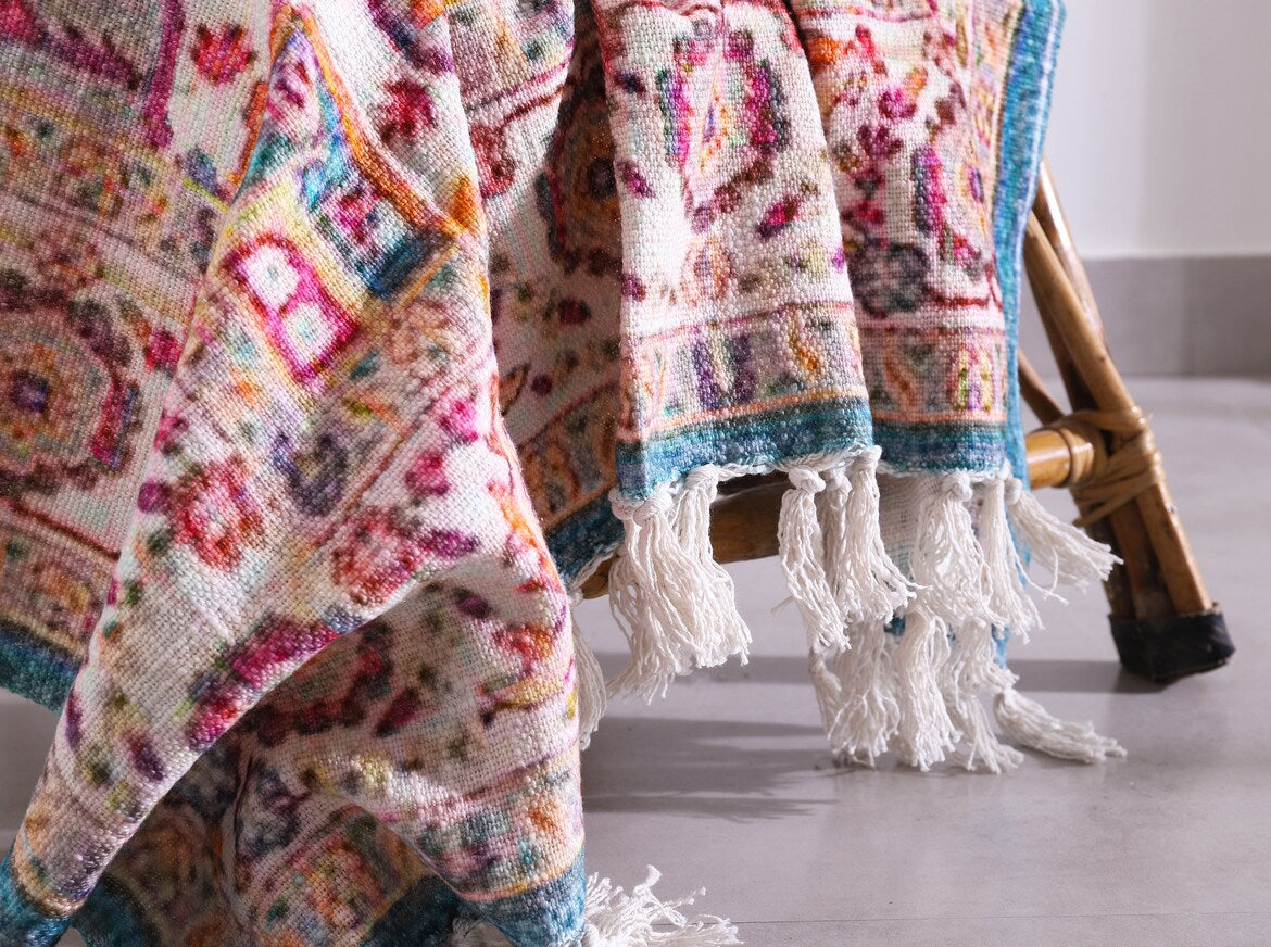 - The throw is screen printed by hand and then stone washed to give it a rustic/ vintage look.