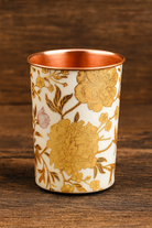 Elevate your serveware with this 275ml pure copper glass, adorned with an intricate gold floral print design. Expertly handcrafted, it features a polished copper interior and a delicate printed exterior that blends traditional artistry with modern elegance.