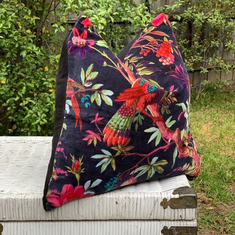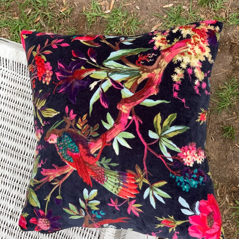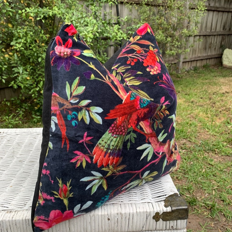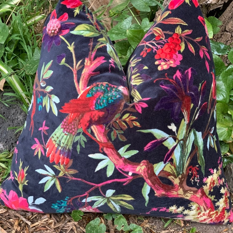 Frida Kahlo inspired bird of paradise design made from cotton velvet at front with cotton linen fabric at the back for extra comfort.