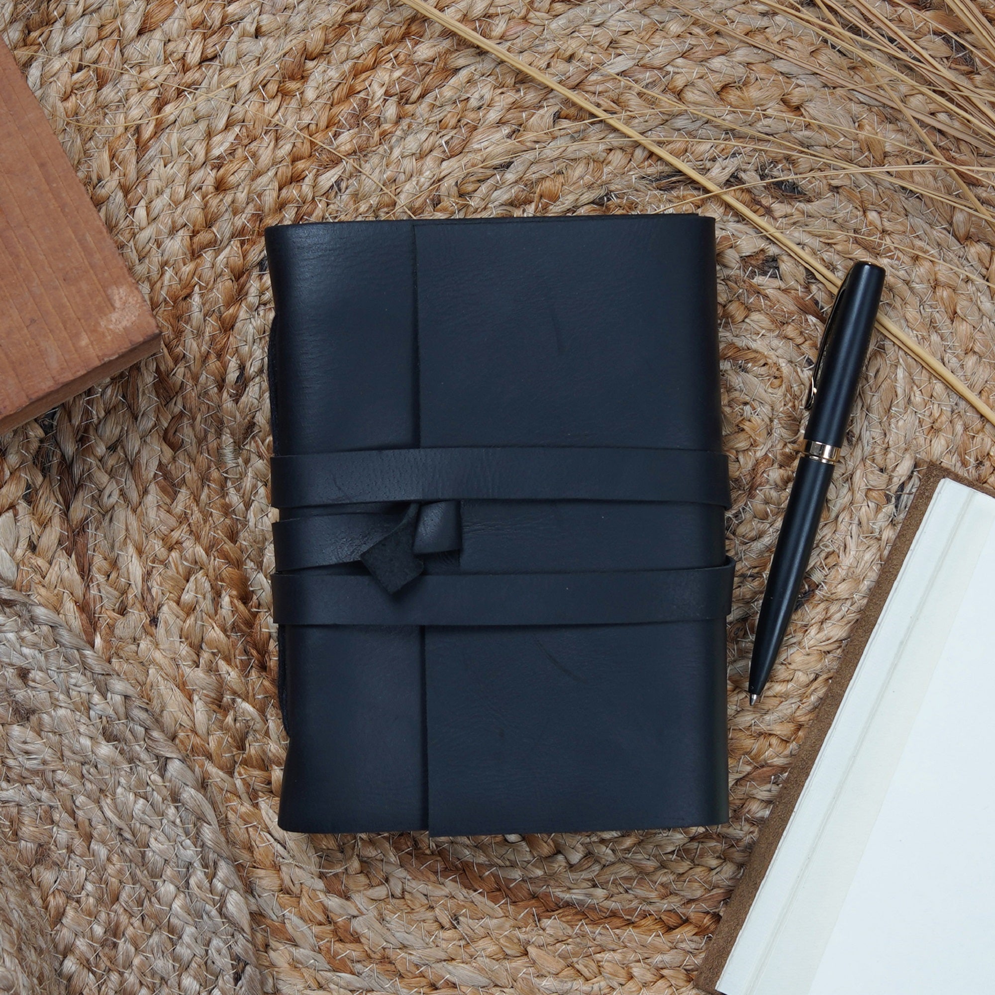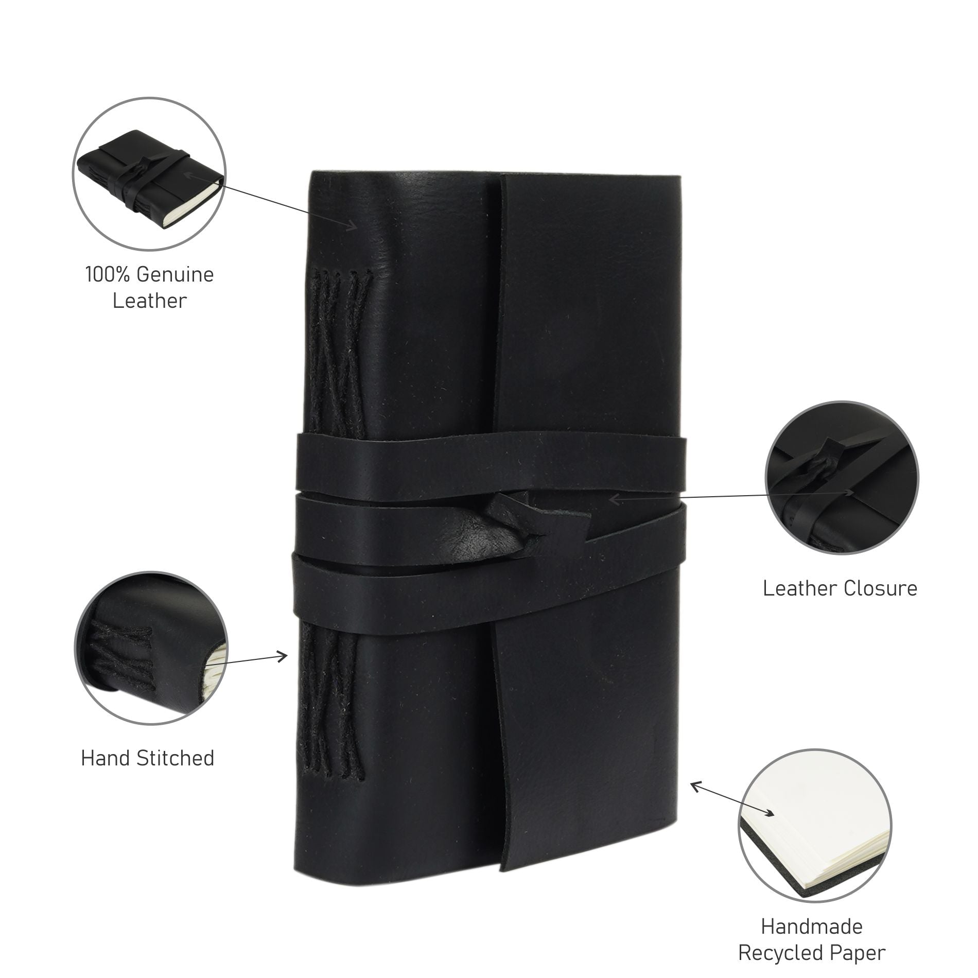 Hand Made from 100% recycled paper. Features 100% genuine cowhide leather cover for the journal.