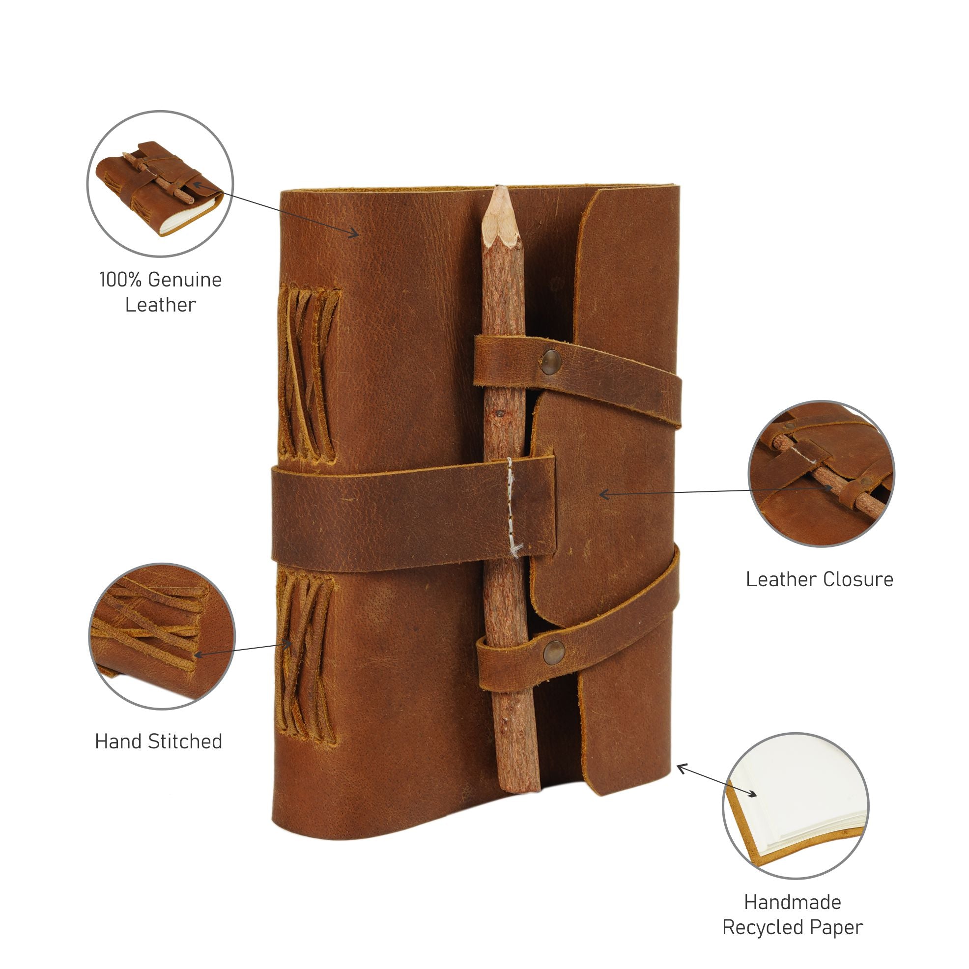 Hand Made from 100% recycled paper. Features 100% genuine cowhide leather cover for the journal.